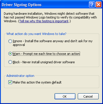 Рис. 23.2. Диалоговое окно Driver Signing Options с установками по умолчанию